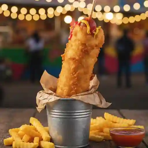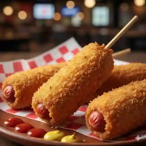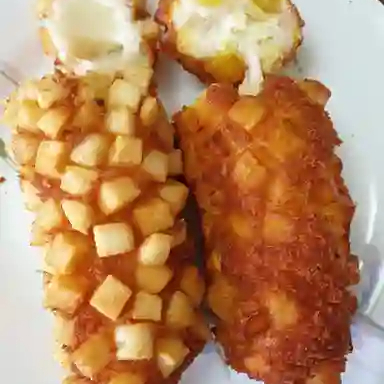 Salchicha cubierta con una masa de harina y frita con queso manchego cubierta con cuadritos de papa 205 g.