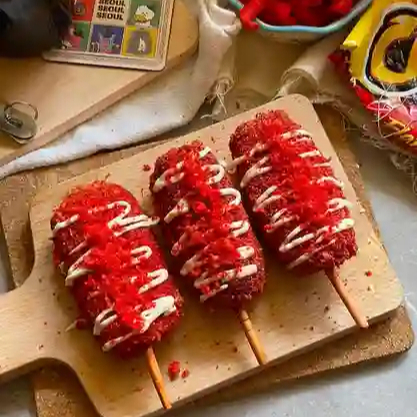 Salchicha cubierta con una masa de harina y frita con queso manchego, queso cheddar, cubierta de Cheetos a elegir 195 g.