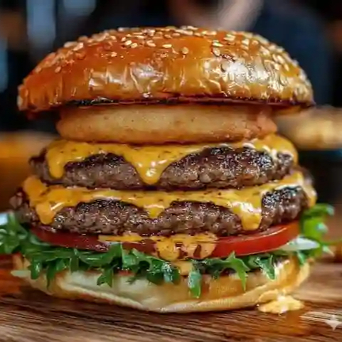 Una hamburguesa a base de mayonesa, queso cheddar, queso estilo americano, queso Oaxaca, lechuga, jitomate, chiles, cebolla caramelizada, cátsup, 2 carnes de res, jamón, más 100 g de papas francesas.