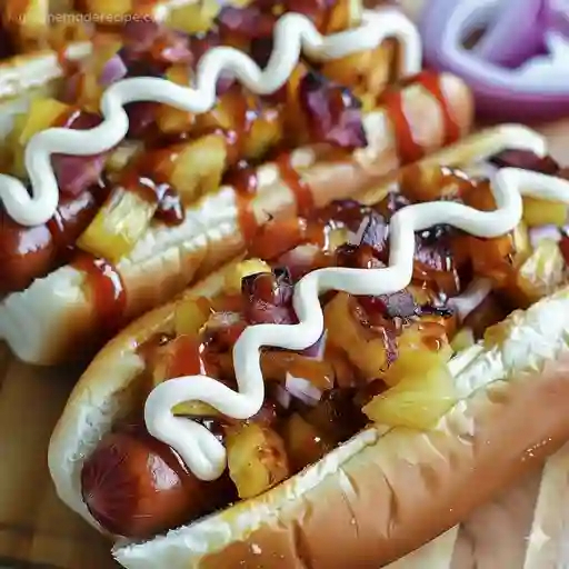 Pan, mayonesa, salchicha, pico de piña, tocino, cátsup, 260 g. Extra: 100 g de papa francesa.