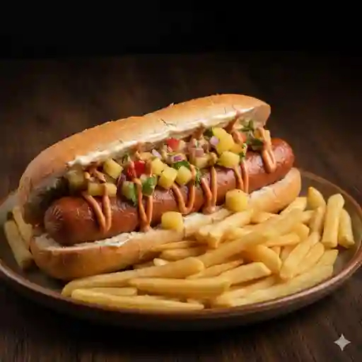 Pan, mayonesa, salchicha, pico de piña, aderezo rosa 245 g. Extra: 100 g de papa francesa.