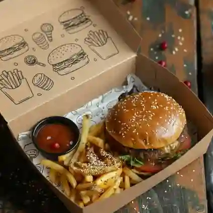 Una hamburguesa a base de mayonesa, queso cheddar, queso estilo americano, lechuga, chiles, cebolla caramelizada, 1 carne de res y 100 g de papas francesas 340 g.