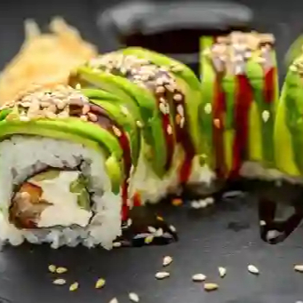 Rollo con camarón empanizado y queso crema. Cubierto totalmente con láminas de aguacate, salsa de anguila y mix de ajonjolí.