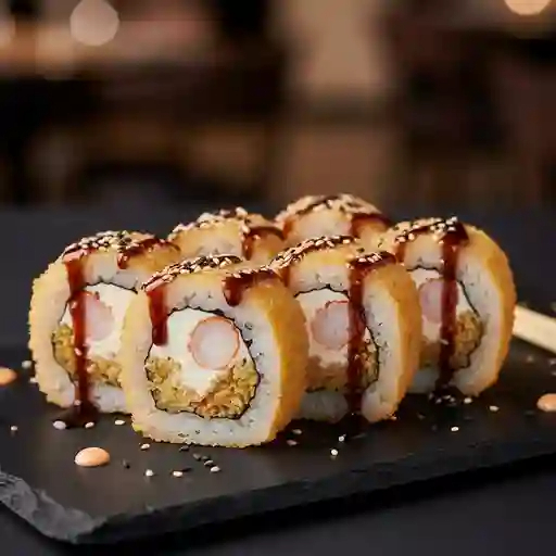 Rollo empanizado con base de arroz yakimeshi, queso crema y camarón. Servido con salsa anguila y mix de ajonjolí.