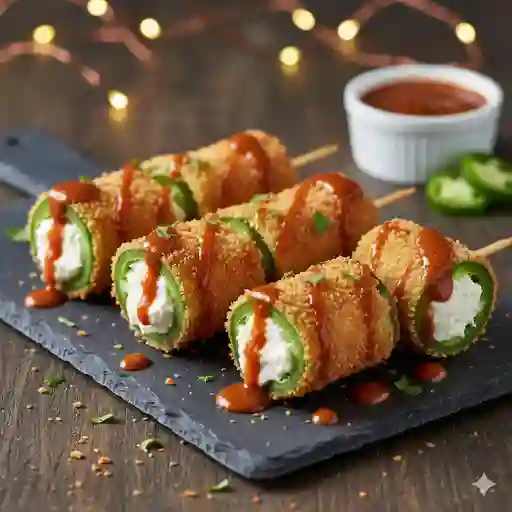 4 Brochetas de chile jalapeño con queso Philadelphia, empanizadas y fritas acompañadas de salsa kushiague salsa oscura, espeso y agridulce 260 g.