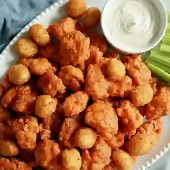 Trozos de pechuga de pollo fritos, 1 salsa, 1 dip ranch, blue cheese, apio, zanahoria y papas a la francesa 500 g.
