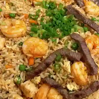 Especialidad de la casa: arroz frito al wok con combinación de res, pollo, camarón y vegetales.