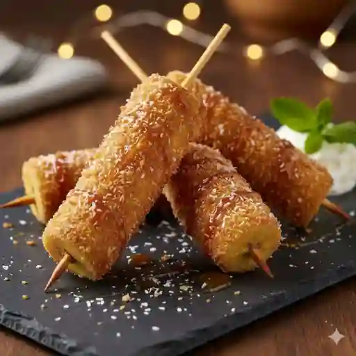 4 Brochetas mixtas queso plátano y queso empanizadas y fritas acompañadas de salsa kushiague salsa oscura, espeso y agridulce.