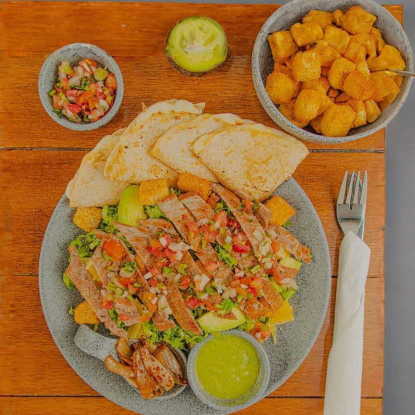 Ensalada con tiras de arrachera, mix de lechugas, crotones, aguacate, pico de gallo, julianas de naranja, aguacate, aderezada con aceite de ajo y parmesano. Servida con guacamole. Acompañado con triángulos de quesadilla (tortilla de harina).