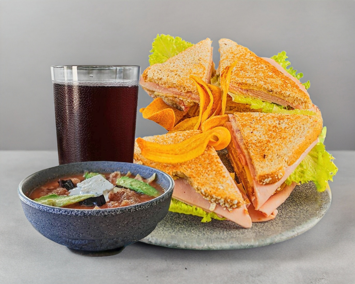 Sándwich de doble piso cortado en cuatro con rollitos de jamón, queso panela, queso manchego, piña, jitomate y lechuga. Aderezado con salsa especial de la casa con un toque picosito.