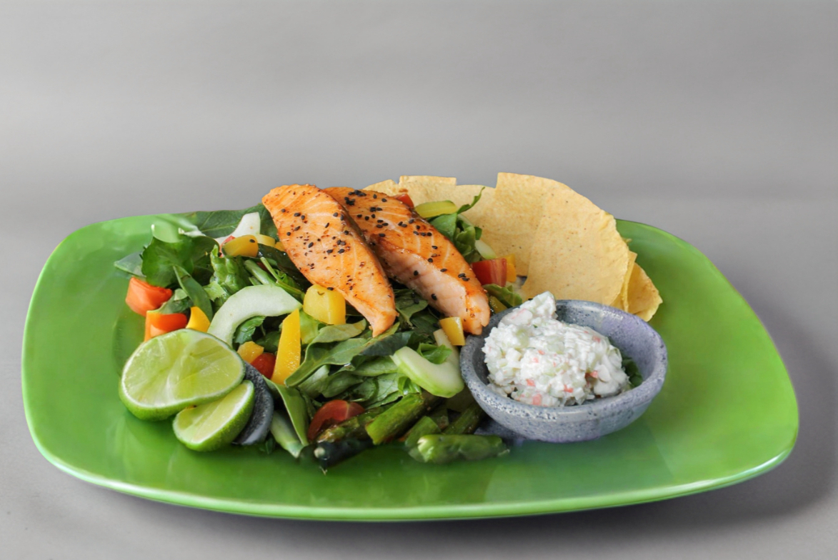 Incluye salmón a la plancha, ajonjolí negro, pepino, durazno, tomate cherry, espinaca baby y espárragos a la mantequilla. Acompañado de dip de surimi, limón y tostadas horneadas.
