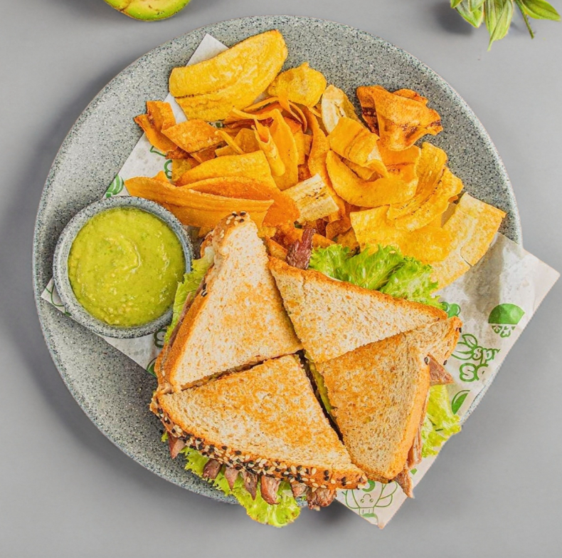 Sándwich de doble piso cortado en cuatro con fajitas de pollo, queso panela, jitomate, cebolla, aguacate y espinaca baby. Aderezado con salsa especial de la casa con un toque picosito.