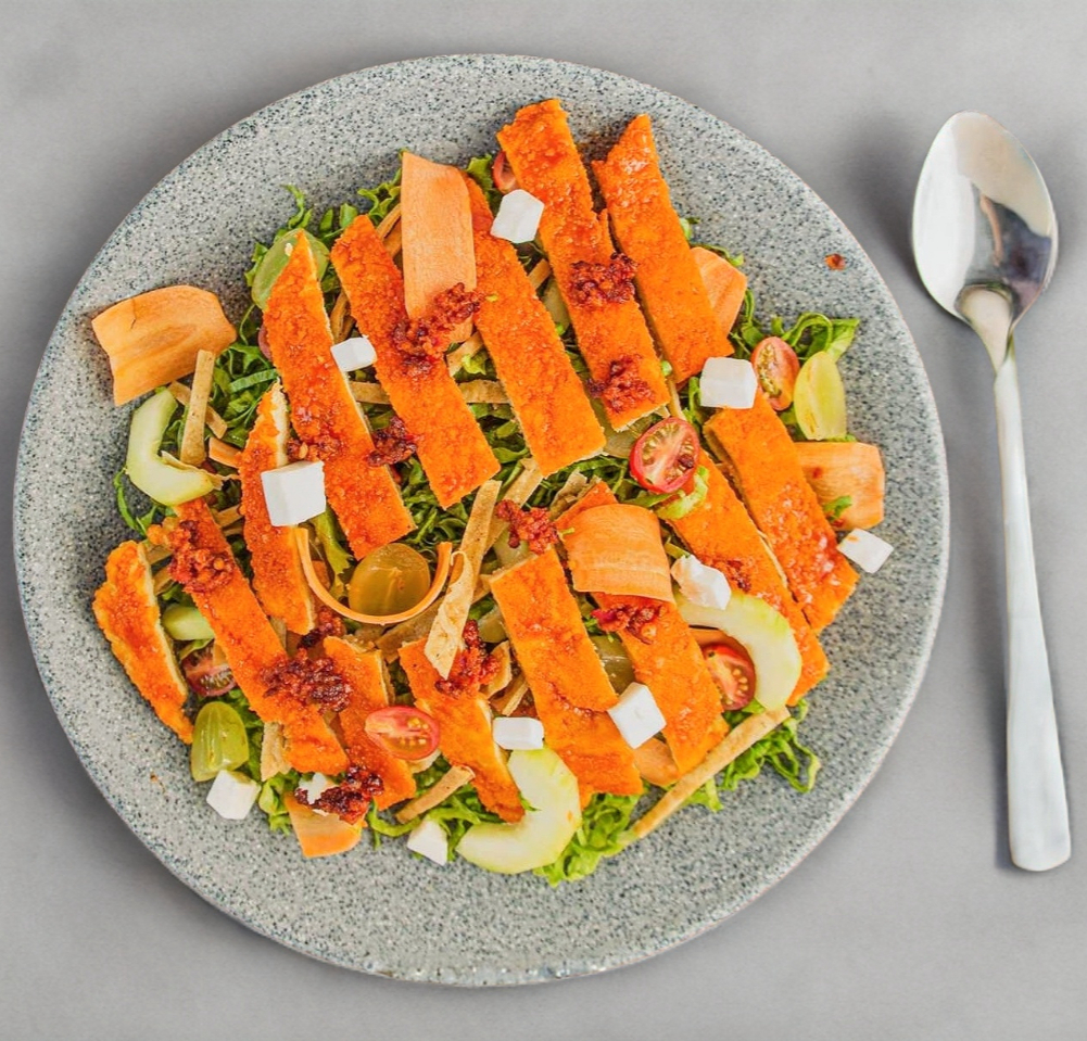 Ensalada con pechuga de pollo empanizada, bañada con wing sauce, mix de lechugas, tocino picado, zanahoria rallada, pepino, uvas, tiritas de tortilla frita y tomate cherry.