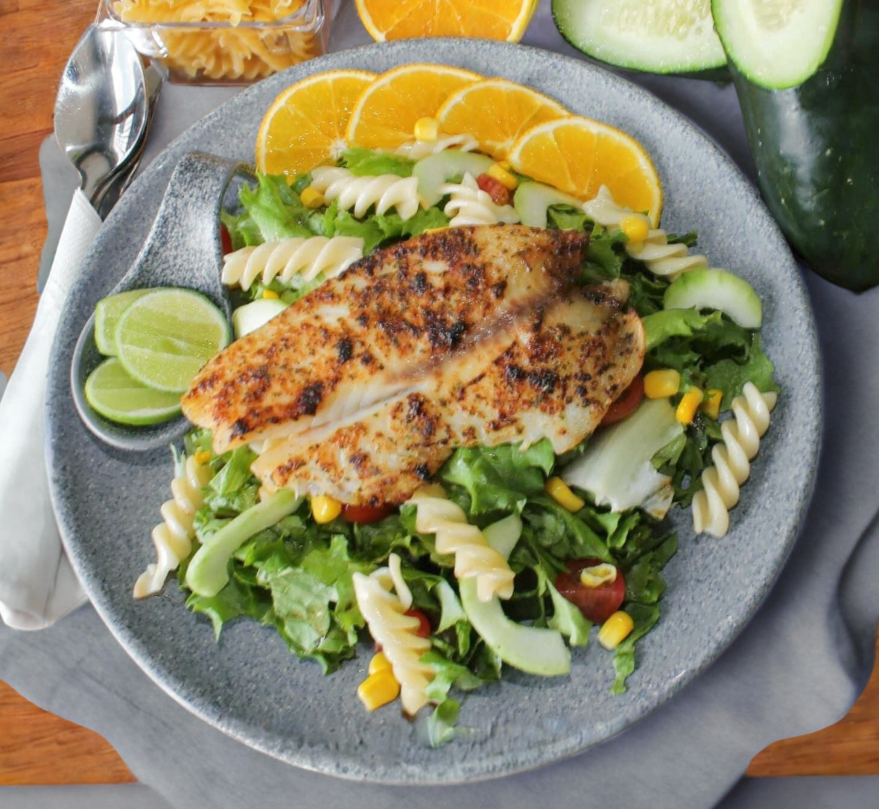 Incluye tilapia, lechuga, elote, ajonjolí caramelizado, pasta, pepino y tomate cherry