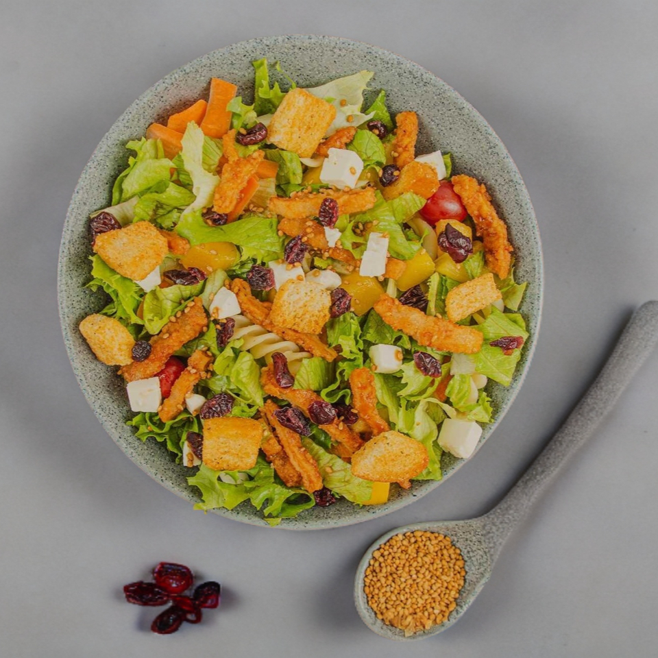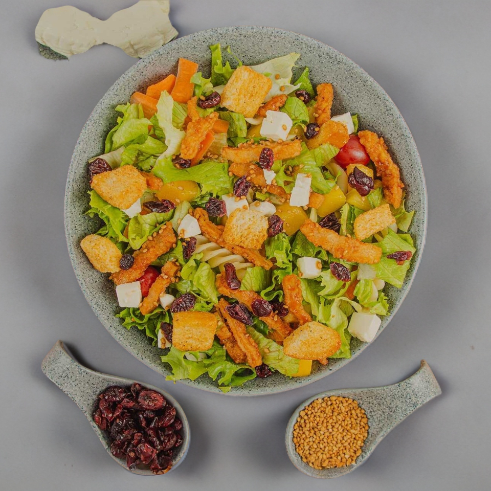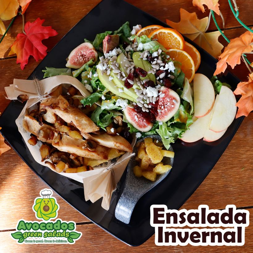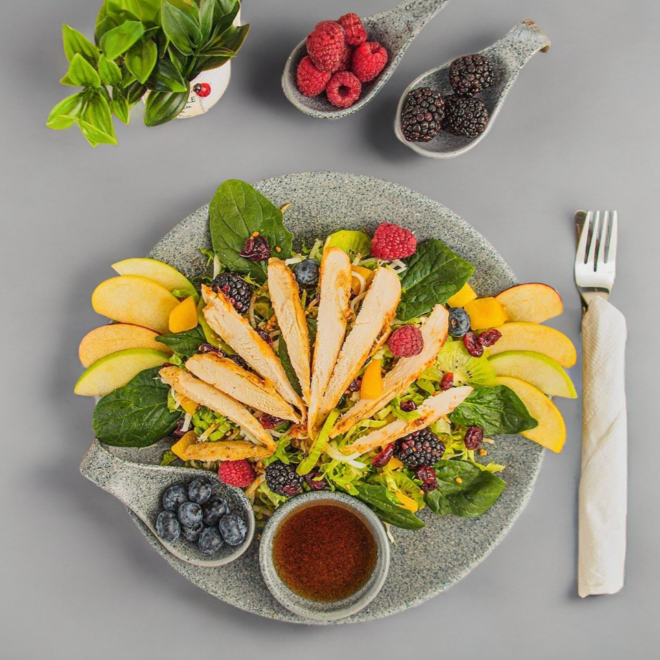 Ensalada con tiras de pechuga de pollo a las hierbas finas con un toque de jalapeño, mix de lechugas, espinaca baby, durazno en almíbar, jícama, manzana, kiwi, baya de temporada, aderezada con vinagre balsámico, ajonjolí caramelizado y arándano.