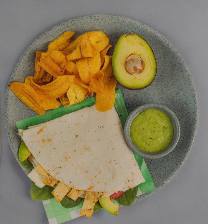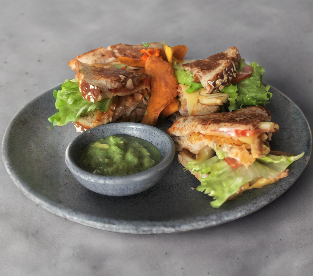Delicioso pan de wrap relleno de fajitas de pollo, queso panela, jitomate, cebolla, aguacate y espinaca baby. Aderezado con salsa especial de la casa con un toque picosito.