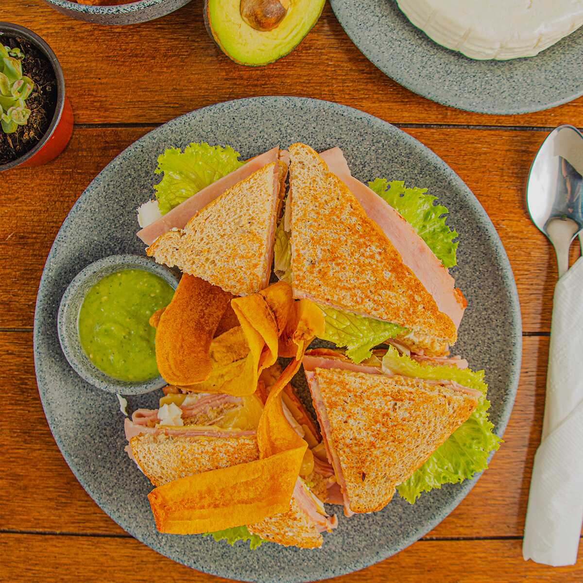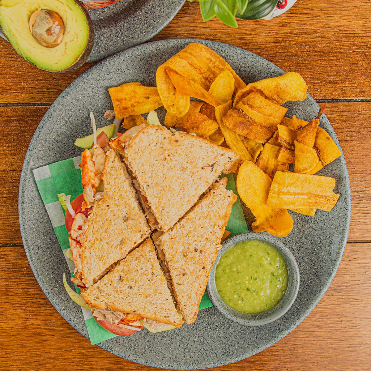Sándwich de doble piso cortado en cuatro con atún, queso manchego con chipotle, cebolla, jitomate, pepino, aguacate y lechuga. Aderezado con salsa especial de la casa con un toque picosito.