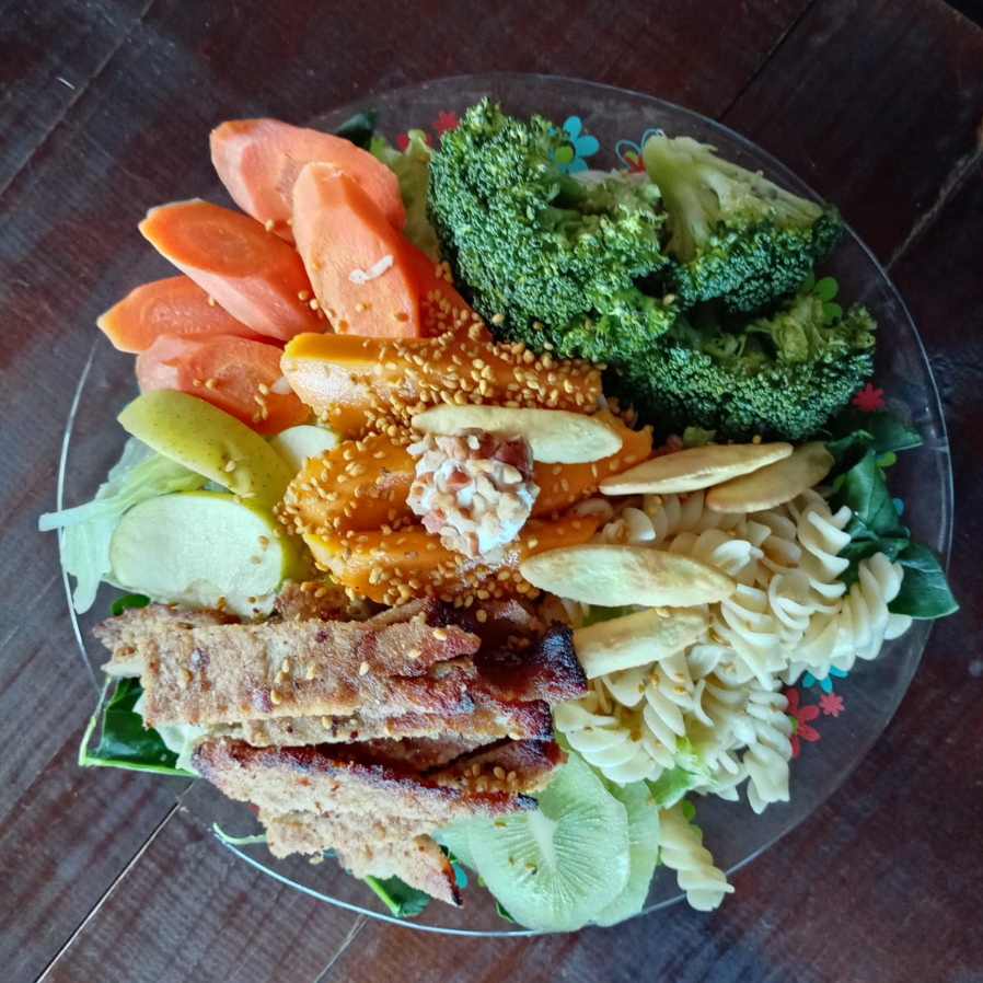 cama de lechuga con espinaca, brocoli, zanahoria, kiwi, mango, manzana, sopa de pasta, biscochitos de pan, bola de queso con nuez, ajonjolí, milanesa empanizada