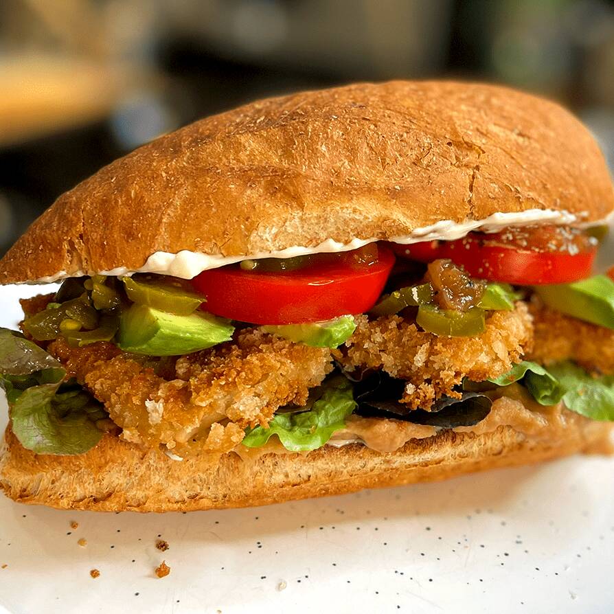Pan con mayonesa, frijoles, lechuga, milanesa empanizada, queso oaxaca, jitomate, cebolla, aguacate y chiles