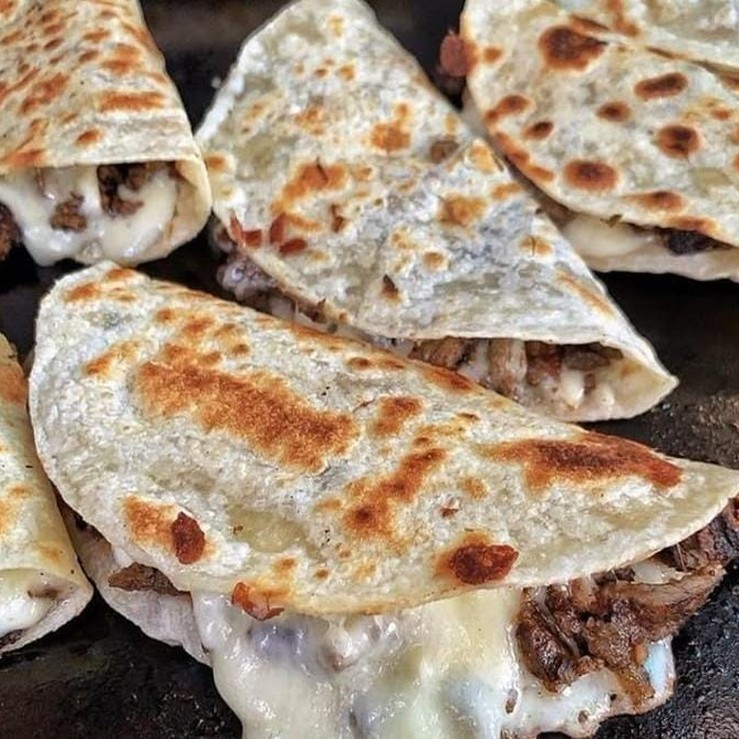 3 quesadillas de tortilla de harina con queso asado, queso oaxaca y salsa