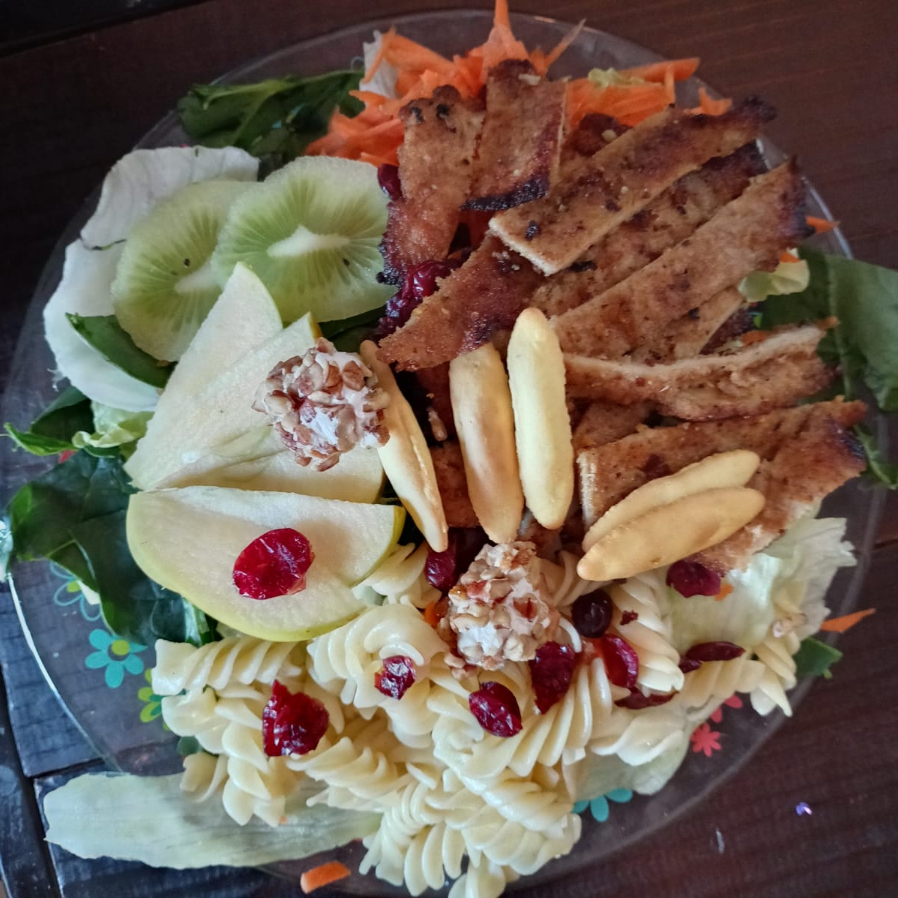sobre una cama de lechuga y espinaca, sopa de pasta, zanahoria rallada, kiwi, manzana, bolas de queso con nuez, arándanos, nuez, biscochitos de pan, aderezo de mostaza dulce y milanesa de pollo empanizada