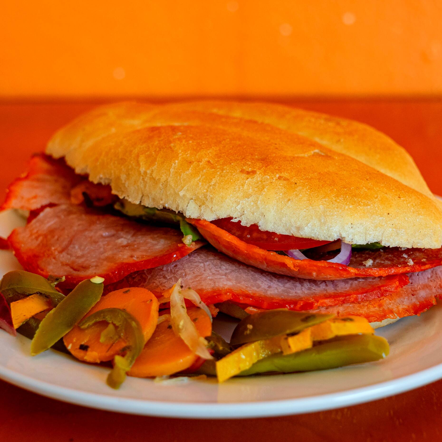 Pan con mayonesa y frijoles, lechuga, pierna española asada, queso oaxaca, cebolla, jitomate, aguacate y chiles