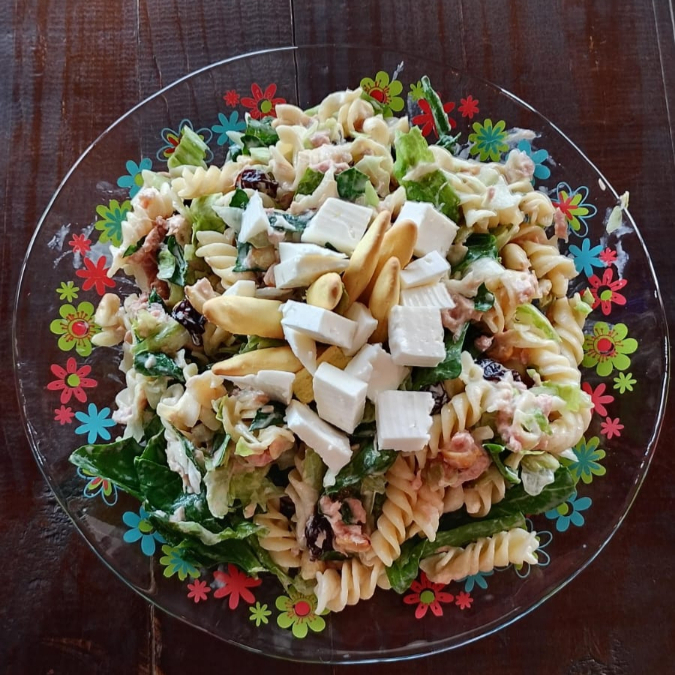 lechuga, espinacas, pasta, atún, mayonesa, queso panela, pasitas, cacahuate, biscohitos de pan, y mostaza dulce