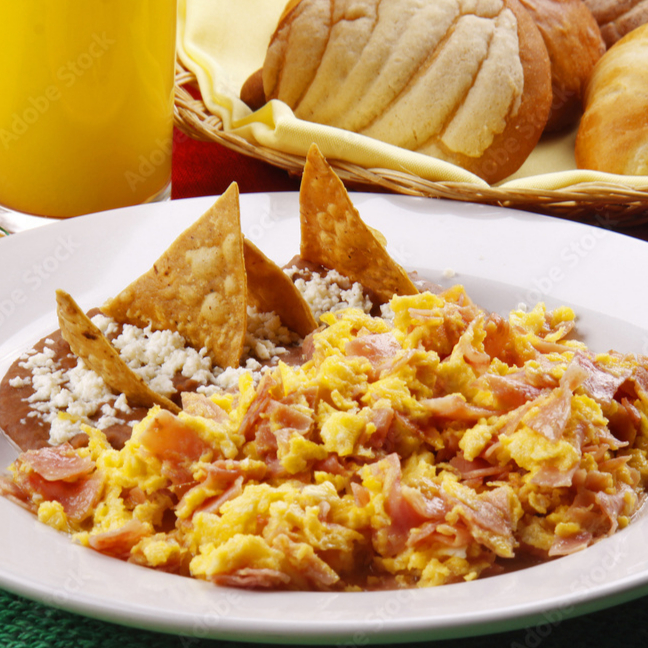huevos revueltos con jamón, acompañados de frijoles refritos, fruta del día y café