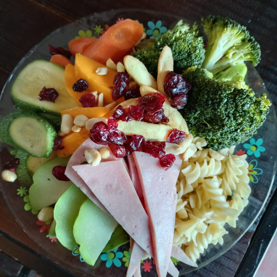 brocoli, zanahoria, calabaza, chayote, sopa de pasta, mango, jamón, cacahuate, arándanos, biscochitos de pan, y aderezo cesar
