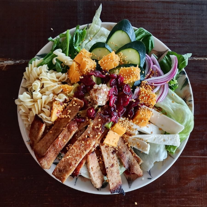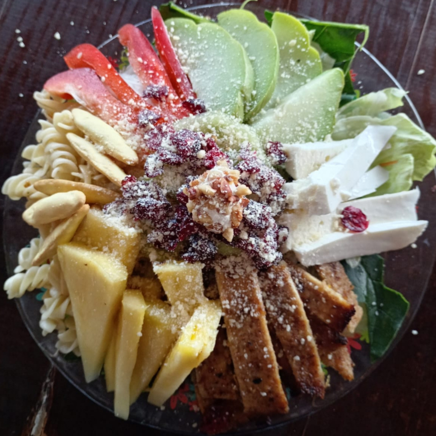 cama de lechuga y espinacas, pepino, aguacate, cebolla morada, mango, queso panela, sopa de pasta, milanesa empanizada, arándano, ajonjolí, bola de queso con nuez y aderezo cesar