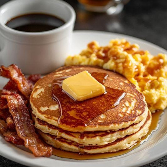 Hot cakes con huevo revuelto, tocino frito, acompañado de fruta del día y café