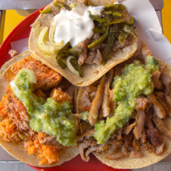 e tacos, doble tortilla de maíz, con tres guisados diferentes del día, acompañado de salsa