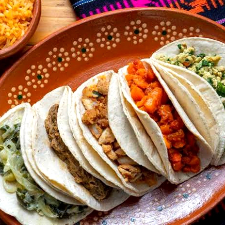 5 tacos, tortilla de maíz, con guisados del día, acompañados de arroz, frijoles y salsa