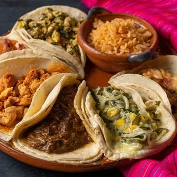 nueve tacos, tortilla de maíz, con guisados del día, acompañados de arroz, frijoles y salsa