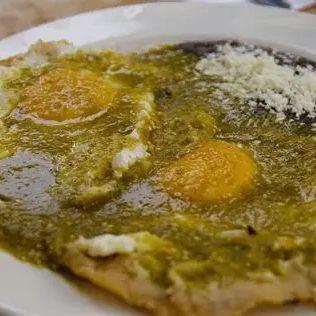 dos huevos estrellados entre tortillas fritas, bañadas en salsa verde con crema, con frijoles refritos acompañados de fruta del día y café