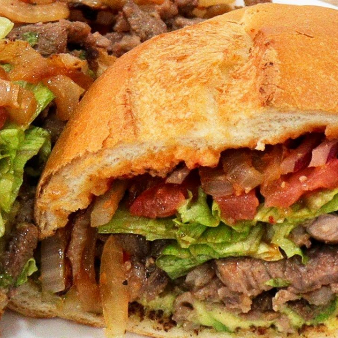 pan con mayonesa, frijoles, bistec asado, lechuga, jitomate, cebolla, aguacate y chiles