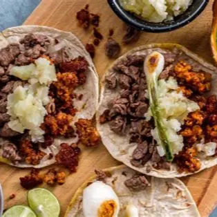 tres tortillas de harina con bistec y longaniza asado, queso gratinado, cebolla caramelizada, acompañada de salsa y limones, para saborear y chuparse los dedos