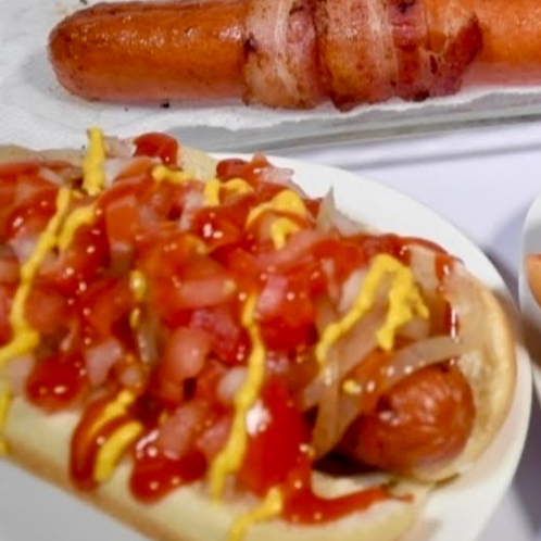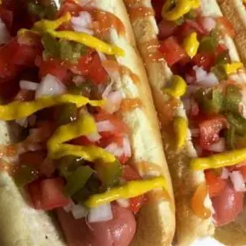 orden de 3 hot dogs, media noche con mayonesa, salchicha asada, queso gratinado, jitomate, cebolla, chiles y aderezos