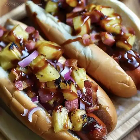 media noche con salchicha, tocino, queso oaxaca, piña, bañado en salsa BBC, acompañado de catsup y mostaza