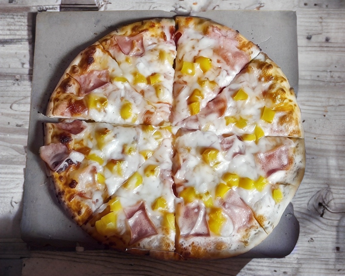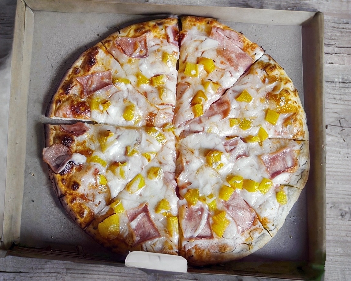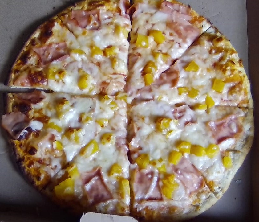 Pizza Grande Hawaiana (8 rebanadas) Preparada con jamón, piña, y una mezcla de quesos: Oaxaca, asadero y manchego.
