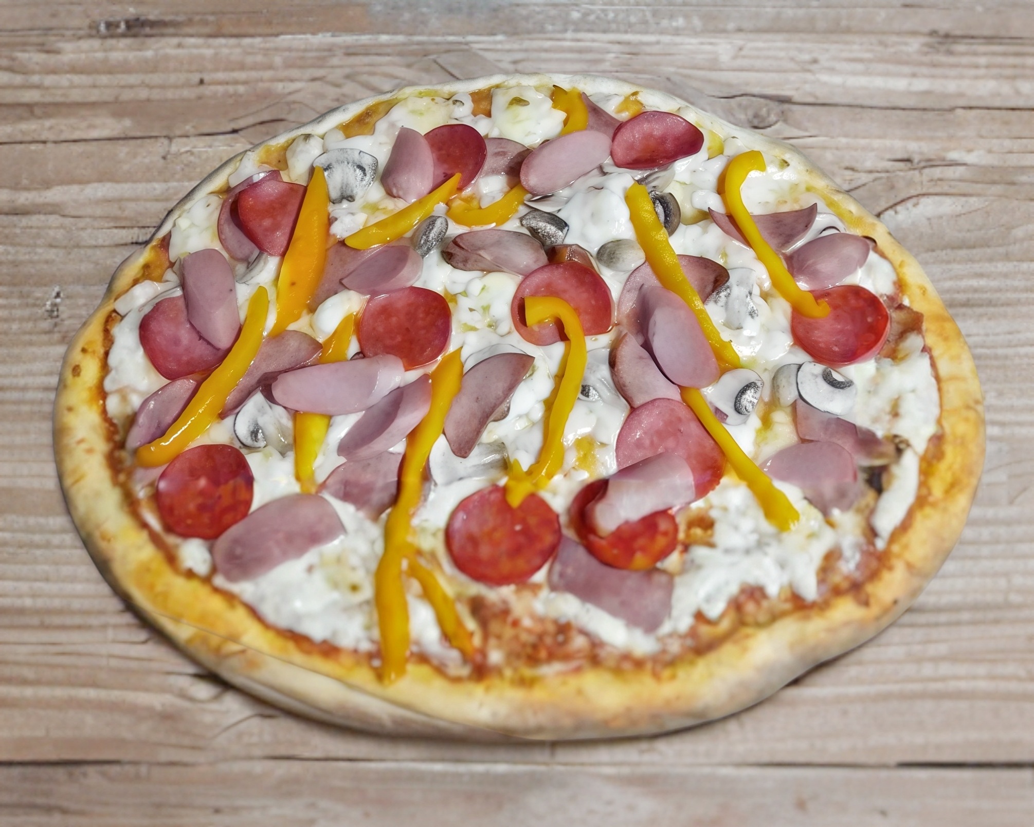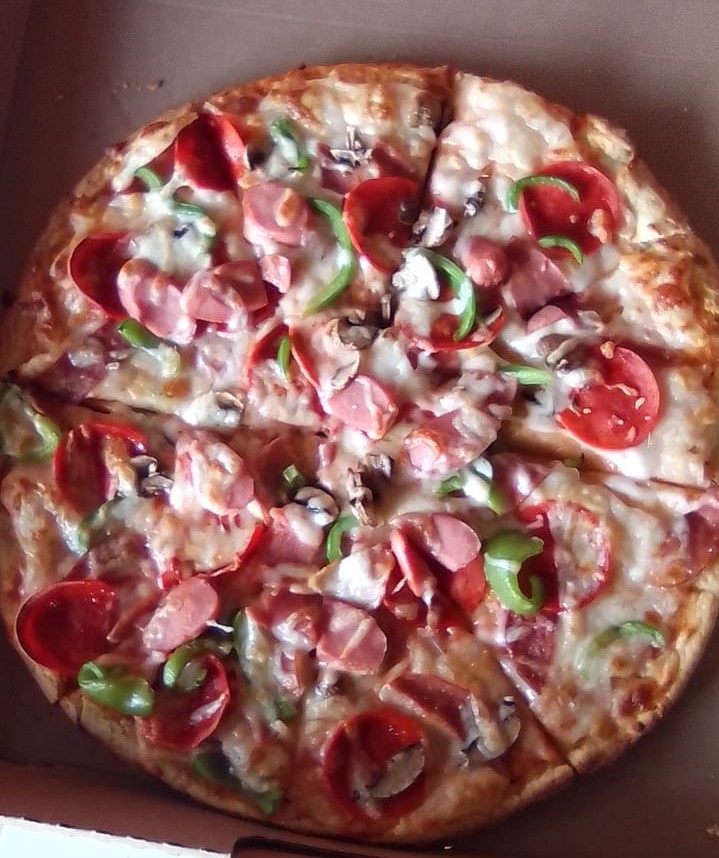 Champiñón, salami, pierna, chorizo y pimiento.