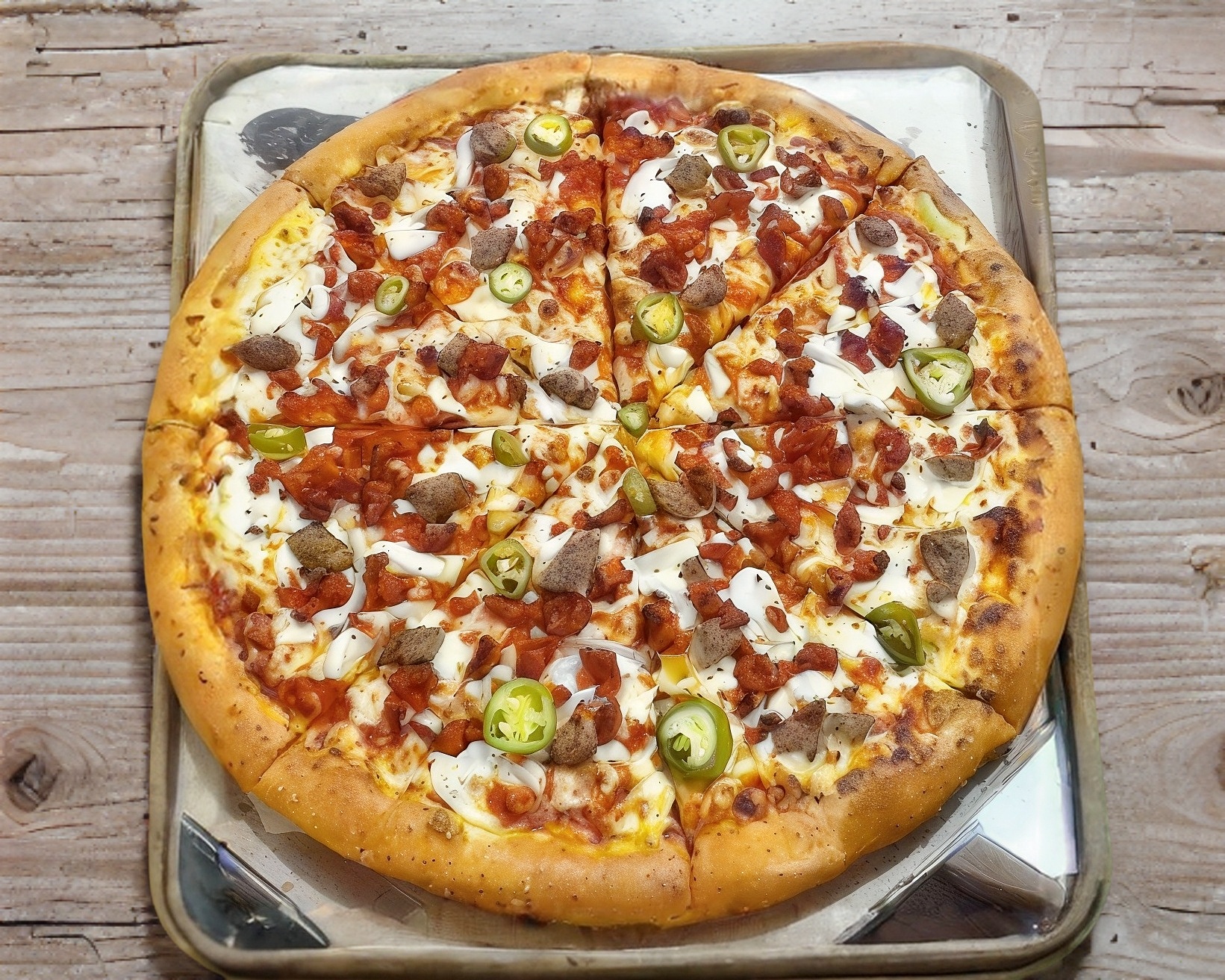 Pizza Grande Pastor de 8 piezas Masa con base de tomate con carne al pastor( 85 gramos ), piña, queso mozarella y quesoo manchego y tocino, con medida de 33cm.