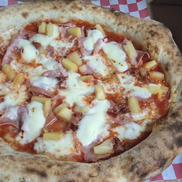 Base de masa más gruesa de tamaño 20 cm aproximádamente. Focaccia cubierta con salsa de tomate de la casa, cubierta de jamón, tocino, piña y queso.
