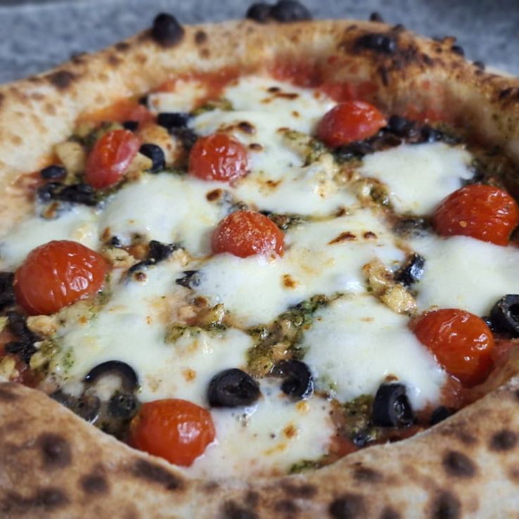 Base de masa más gruesa de tamaño 20 cm aproximádamente. Focaccia cubierta con salsa de tomate de la casa, mozzarella fresca y albahaca.