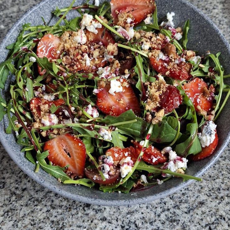 Ensalada fresca, con base de espinacas y frutas de temporada con un toque de frutos rojos.