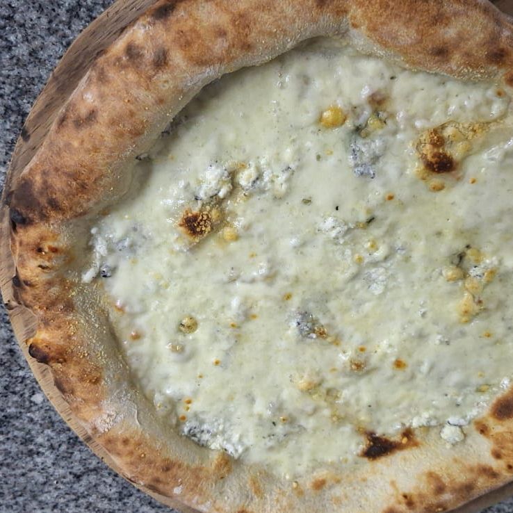 Base de masa más gruesa de tamaño 20 cm aproximádamente. Focaccia cubierta con mezcla de quesos (queso azúl, mozzarella, parmesano y de cabra).