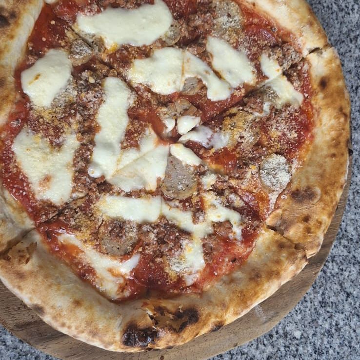 Base de masa más gruesa de tamaño 20 cm aproximádamente. Focaccia cubierta con salsa de tomate de la casa, mozzarella y hongos.
