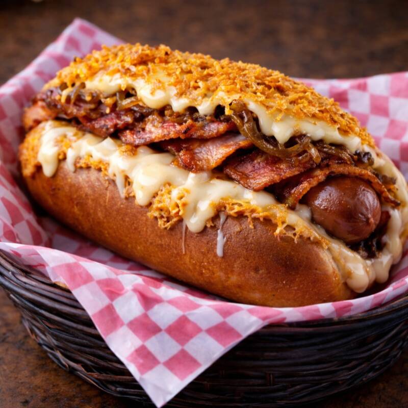 Salchicha jumbo tradicional de pavo rellena con queso, envuelto en tocino con cebolla caramelizada, cátsup, mayonesa, mostaza y papas a la francesa.