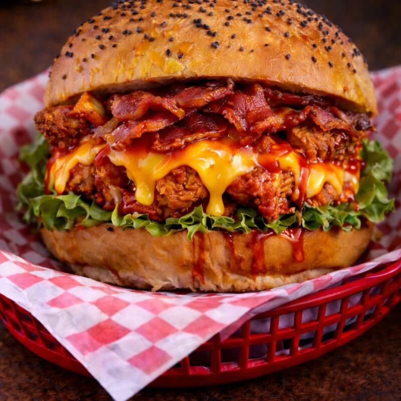 Doble nugget de pollo, pan artesanal a base de mantequilla, queso americano, lechuga, jitomate y cebolla caramelizada.