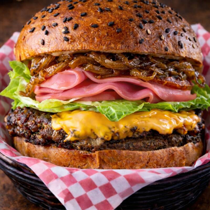 Carne de res, pan artesanal elaborado a base de mantequilla ,queso americano, jamón, lechuga, jitomate y cebolla caramelizada.